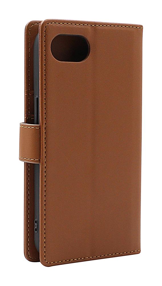 De nya modellerna av Skimblocker-fodral har en vikfunktion på baksidan som gör att mobilen kan stå upp i en lutande vinkel. Du kommer att se att bara halva baksidan av skalet är fäst i fodralet – det är helt enligt design och inte ett tillverkningsfel. Viklinjen är också synlig på baksidan, just för att möjliggöra denna funktion. Se gärna bilderna i annonsen för att få en tydlig bild av hur det fungerar.