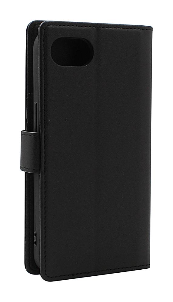 De nya modellerna av Skimblocker-fodral har en vikfunktion på baksidan som gör att mobilen kan stå upp i en lutande vinkel. Du kommer att se att bara halva baksidan av skalet är fäst i fodralet – det är helt enligt design och inte ett tillverkningsfel. Viklinjen är också synlig på baksidan, just för att möjliggöra denna funktion. Se gärna bilderna i annonsen för att få en tydlig bild av hur det fungerar.